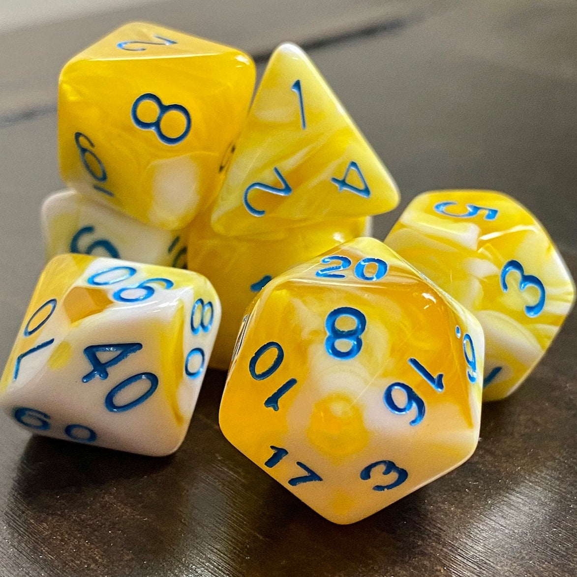 Swirling with velvety warm butter, these polyhedral dice are perfect for your favorite Tabletop Role Playing Game, including Dungeons & Dragons and Pathfinder. Buy them for yourself and be the envy of your dnd group! Or give them as a gift to friends and loved ones.